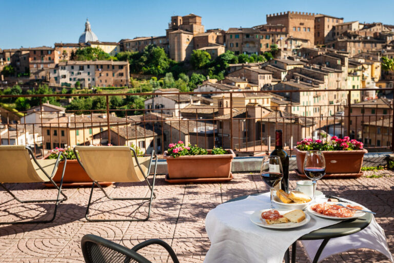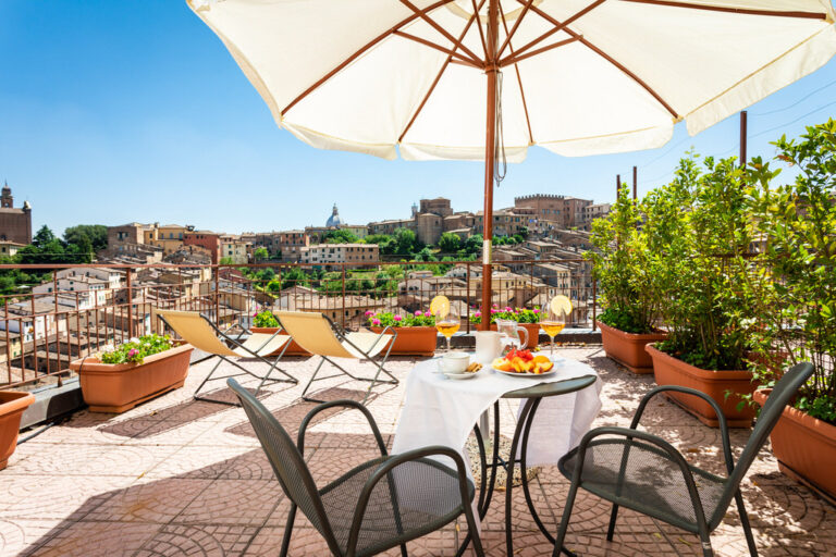 Camere con vista sul centro storico di Siena. Bellissima vista mozzafiato su uno dei rioni più antichi della città – Contrada della Lupa – con la possibilità di avere un comodo terrazzino da dove ammirare le mura storiche e lasciare che la vostra immaginazione possa immergersi nelle storiche atmosfere della città.