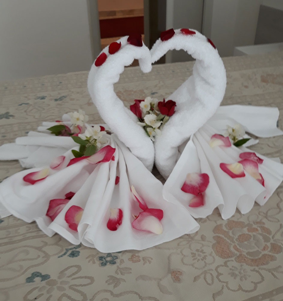 Una speciale accoglienza con brindisi di benvenuto accompagnata da una romantica sorpresa ti aspettano al tuo arrivo in hotel.